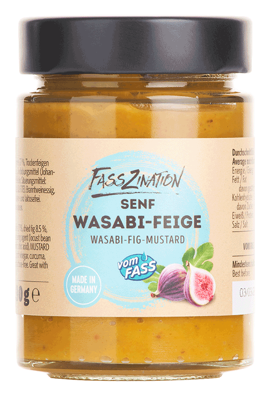 Zutaten: Feigenzubereitung (49 %) (Feigenpüree (27 %), Trockenfeigen (8,5 %), Zucker, Invertzuckersirup, Glukosesirup, Verdickungsmittel (Johannisbrotkernmehl, Guarkernmehl), Geliermittel Pektin, Säuerungsmittel: Citronensäure), SENFSAAT, Meerrettich (enthält SULFITE), Branntweinessig, Kurkuma, natürliches Wasabiaroma.